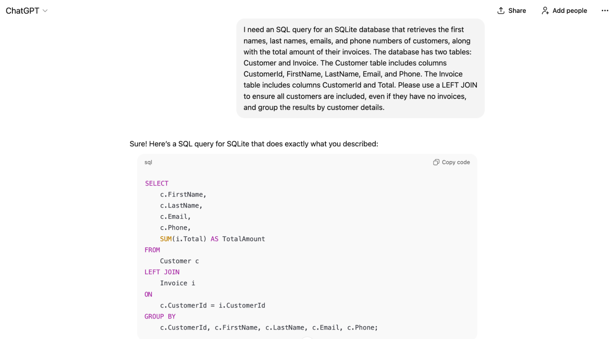 Prompt in ChatGPT: “I need an SQL query for an SQLite database that retrieves the first names, last names, emails, and phone numbers of customers, along with the total amount of their invoices. The database has two tables: Customer and Invoice. The Customer table includes columns CustomerId, FirstName, LastName, Email, and Phone. The Invoice table includes columns CustomerId and Total. Please use a LEFT JOIN to ensure all customers are included, even if they have no invoices, and group the results by customer details.”