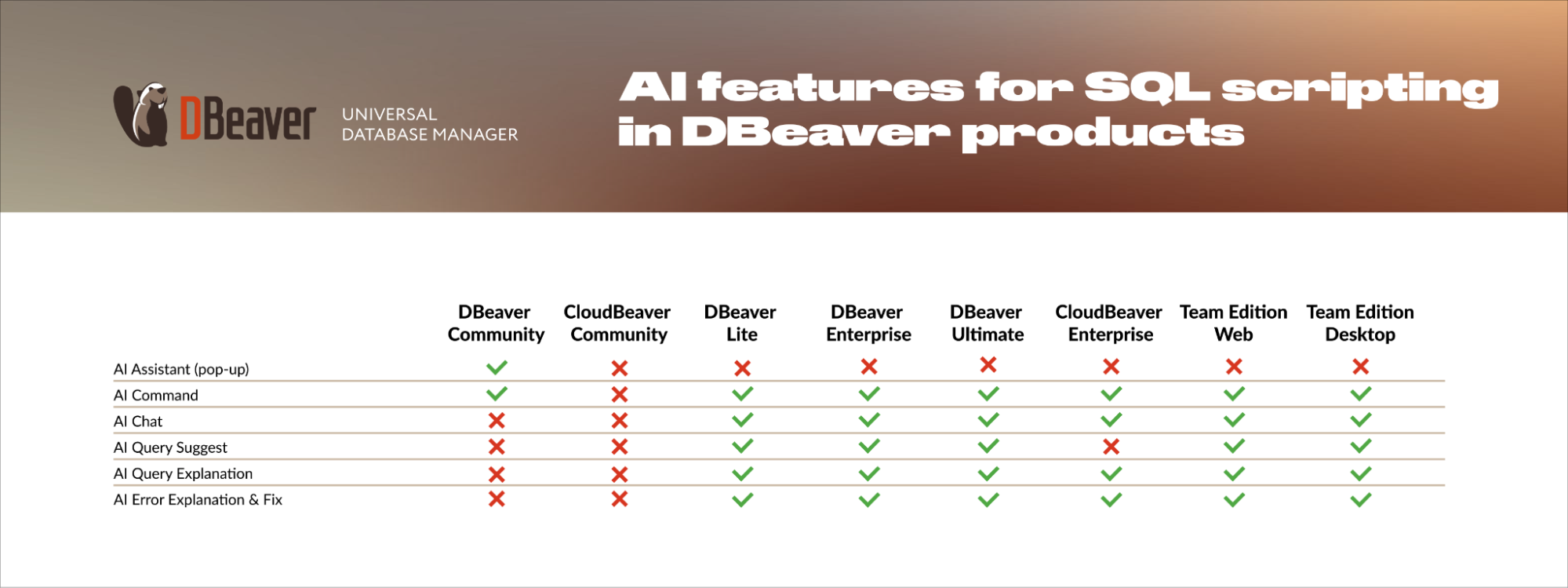 You can use AI Assistant and AI Command in DBeaver Community for free. All DBeaver PRO products offer a 14-day free trial, so you can test the full AI feature set before committing.
