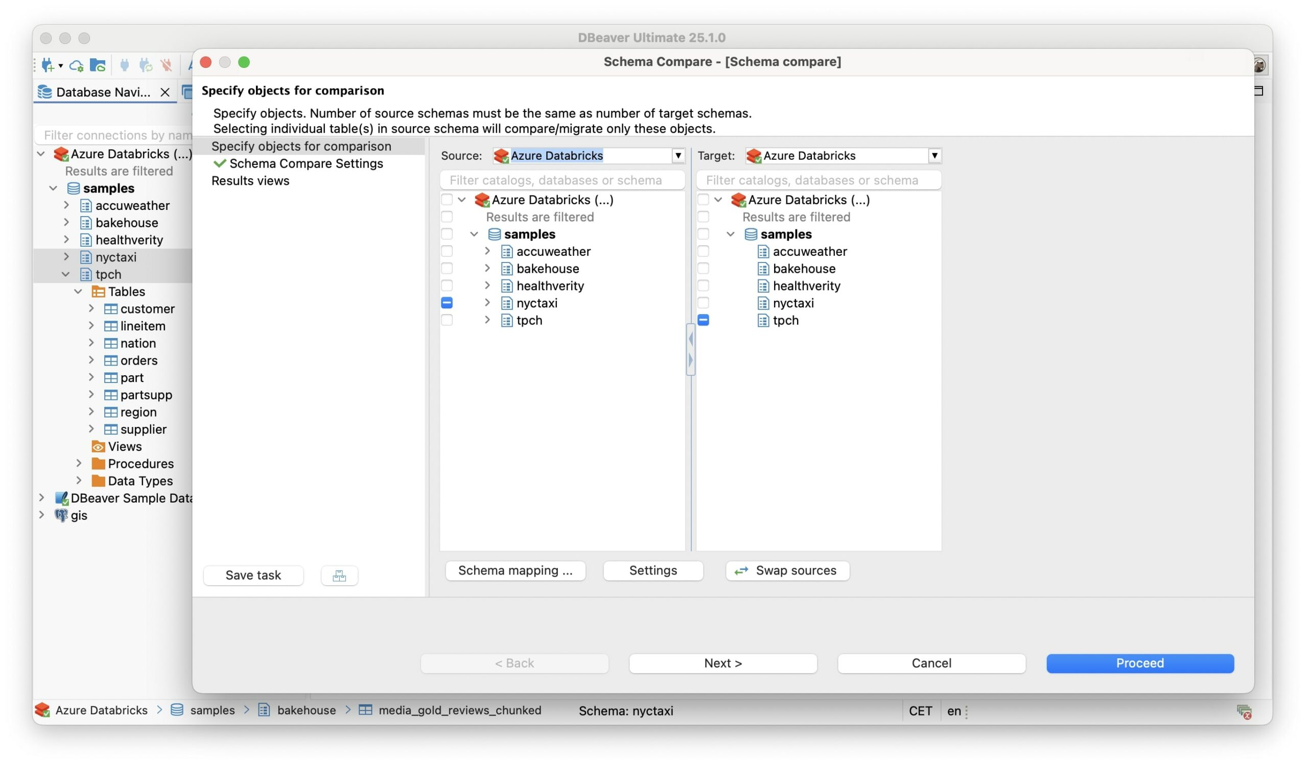 Compare database schemas (staging vs. production) and identify structural differences. Then, synchronize or migrate changes between database environments.