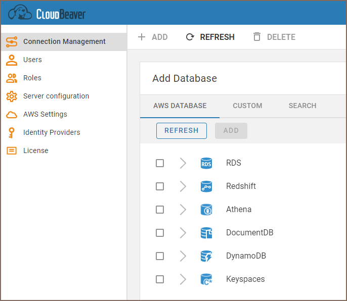 Once you configure the AWS Settings|AWS-Settings you can open the Cloud Explorer and start adding AWS database connections. The principle is similar to the usual connections that means you can add connection from the Administration part and from the Public part of the app.
