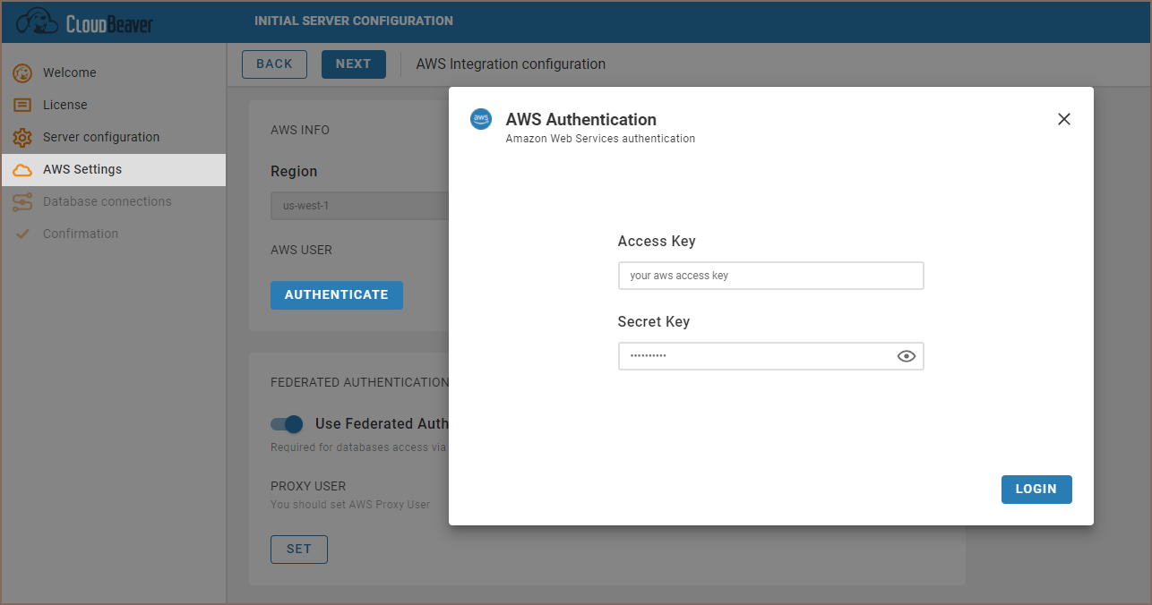 To get access to the AWS Services from the CloudBeaver you need to authenticate to your AWS Account. All CloudBeaver AWS settings will depend on this AWS account permissions. You will not be able to change entered AWS credentials after the end of configuration process. Also, these credentials will be automatically assigned to the administrator in CloudBeaver. We highly recommend to create a special AWS user with all required permissions for the administrator account.