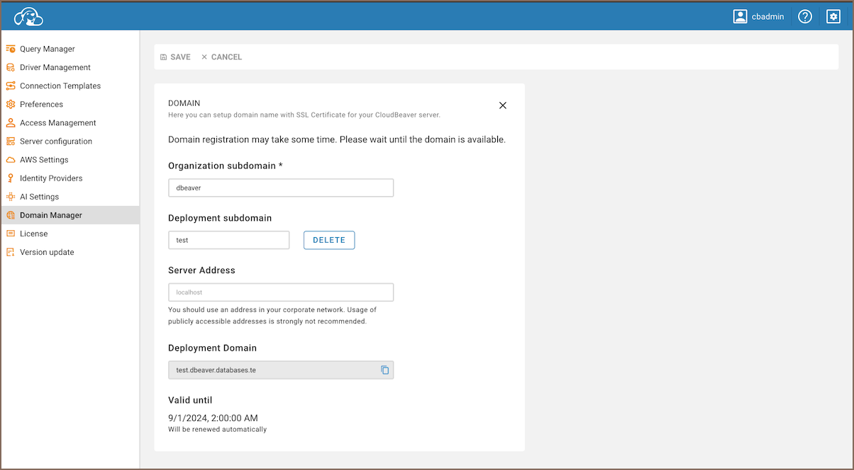 Domain creation on a bare server: Setting up a domain on a server without any existing domains can be complicated, often requiring changes to DNS settings and other technical configurations. The Domain Manager simplifies this process, making it easy to set up a domain and improve accessibility and management without complex manual setup. CloudBeaver provides the domain