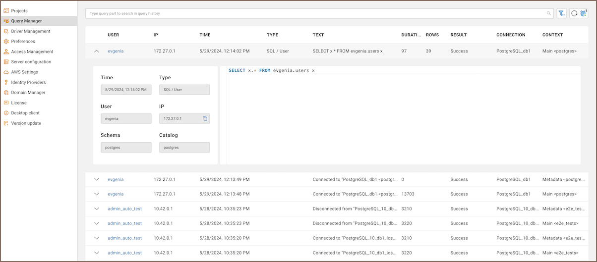 | Sorting by | Choose the attribute to sort the queries by (available options: User, Date, Driver, Quuery text). |