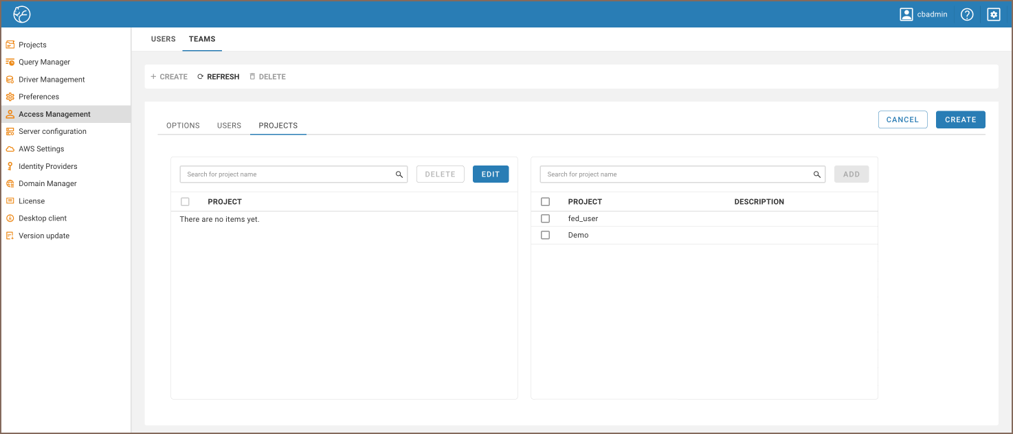In the Projects tab, administrators can manage which projects are available to the Team: