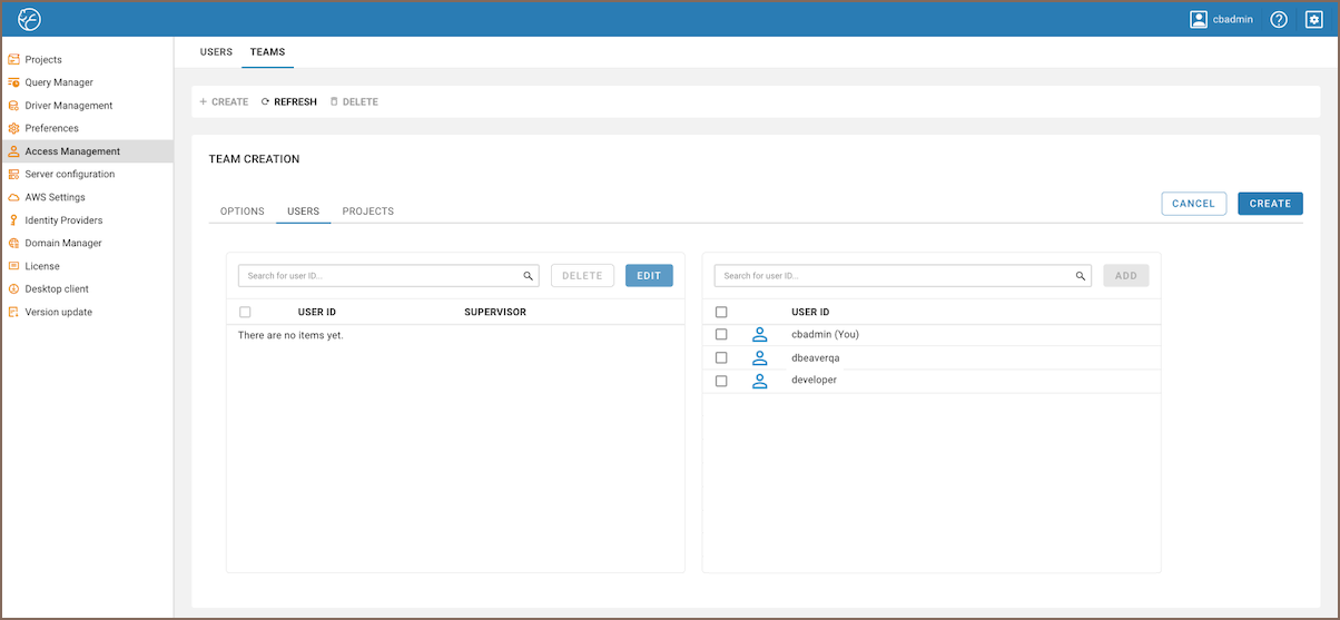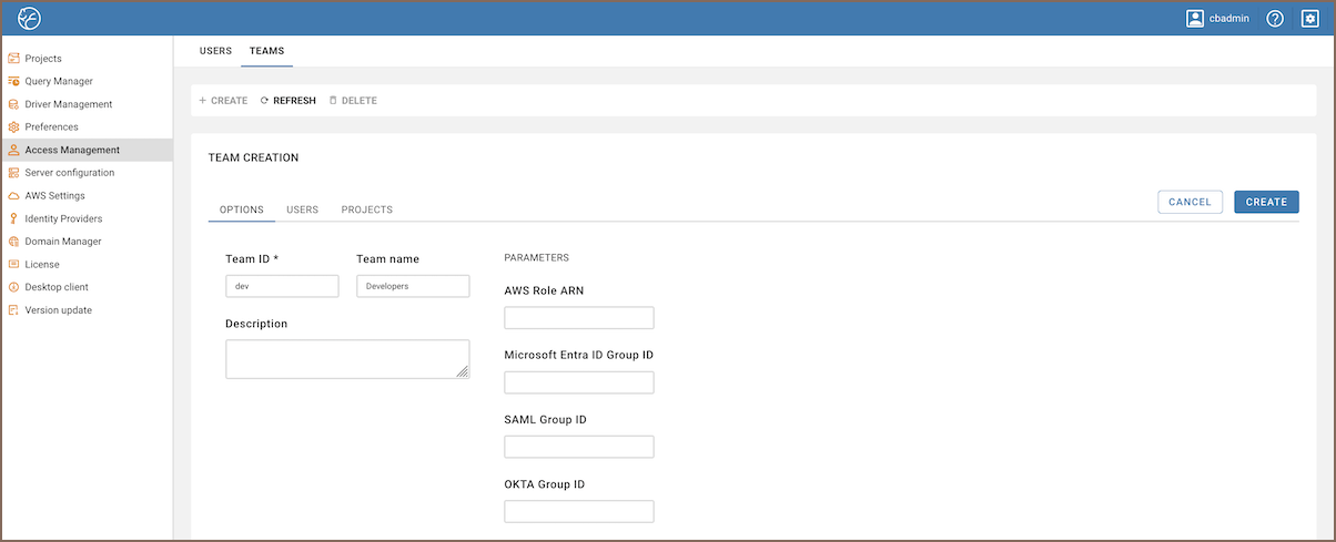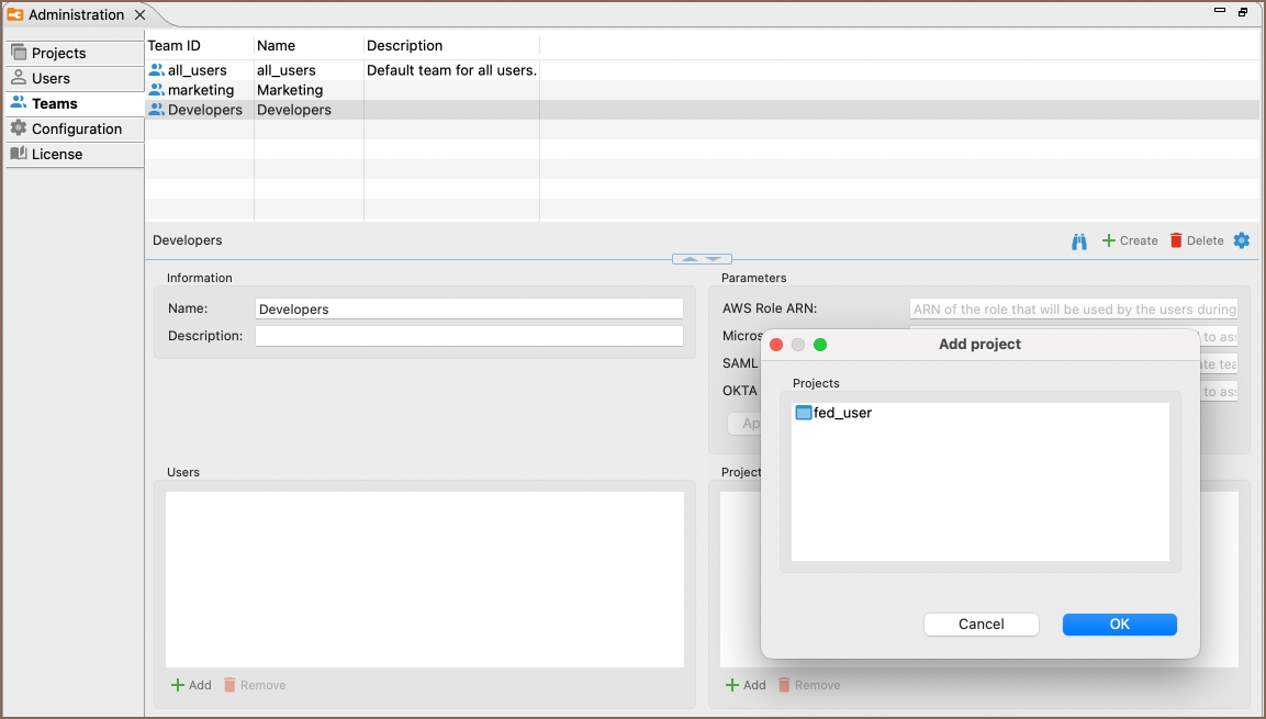 - As administrator, go to the Settings -> Administration -> Access Management -> Teams.