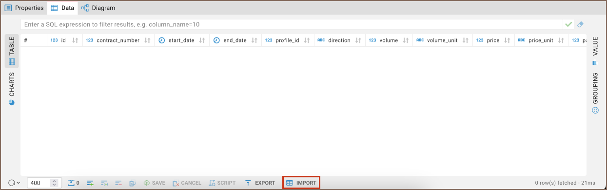 In CloudBeaver, data import is accessible through the Data Editor when a table is open.