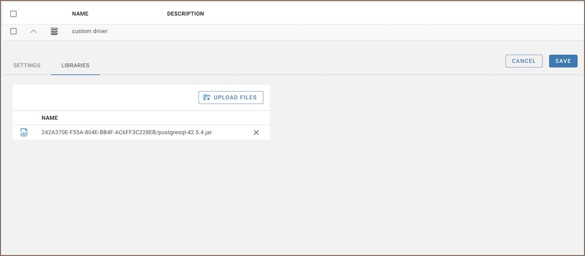 To make your new custom driver functional, you need to upload the .jar binary files. Follow these steps: