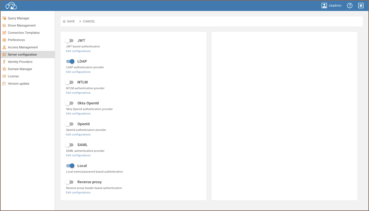 .cloudbeaver.runtime.conffile to configure LDAP for the current workspace or the.cloudbeaver.conffile to set the LDAP provider for all newly created workspaces. More details can be found in the server configuration guide. - Open the file with a text editor to modify or add LDAP configurations.