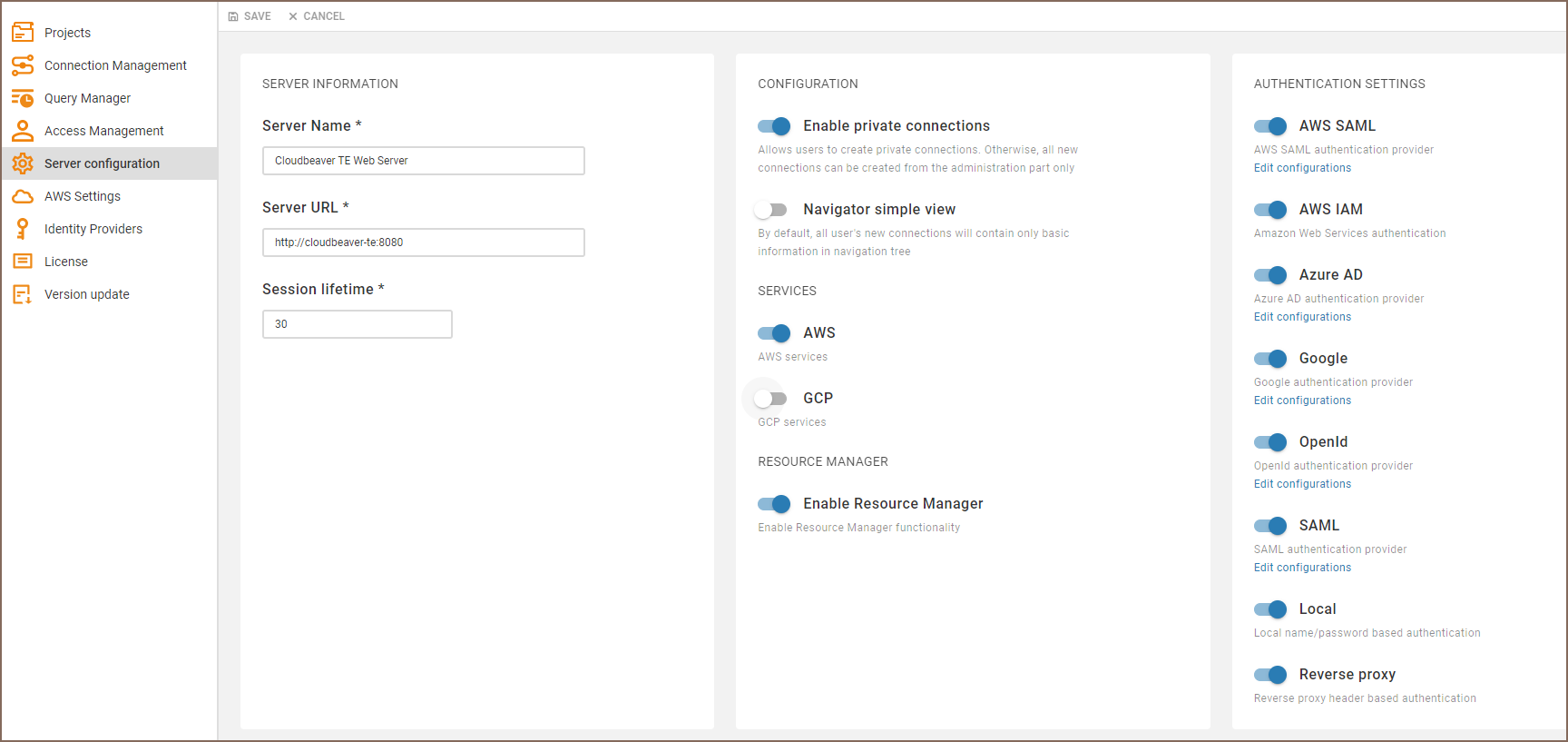 You can keep third party catalog service like Active Directory to keep your users and manager authentication. To use them in DBeaver/CloudBeaver your need to configure identity provider(s.md). 1. Go to administration panel, switch to tab "Server Configuration" and enable needed services and authentication methods:
