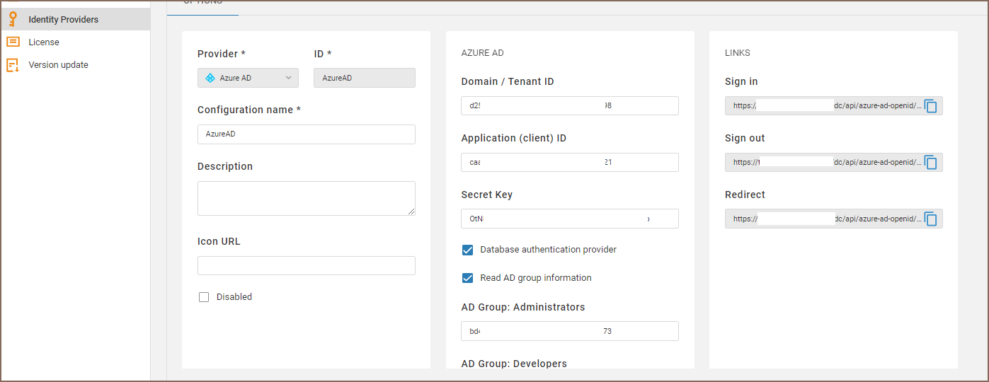 | AD Group: Developers | AD group identitiers (coma separated). Users from these groups will be granted with Developer role |