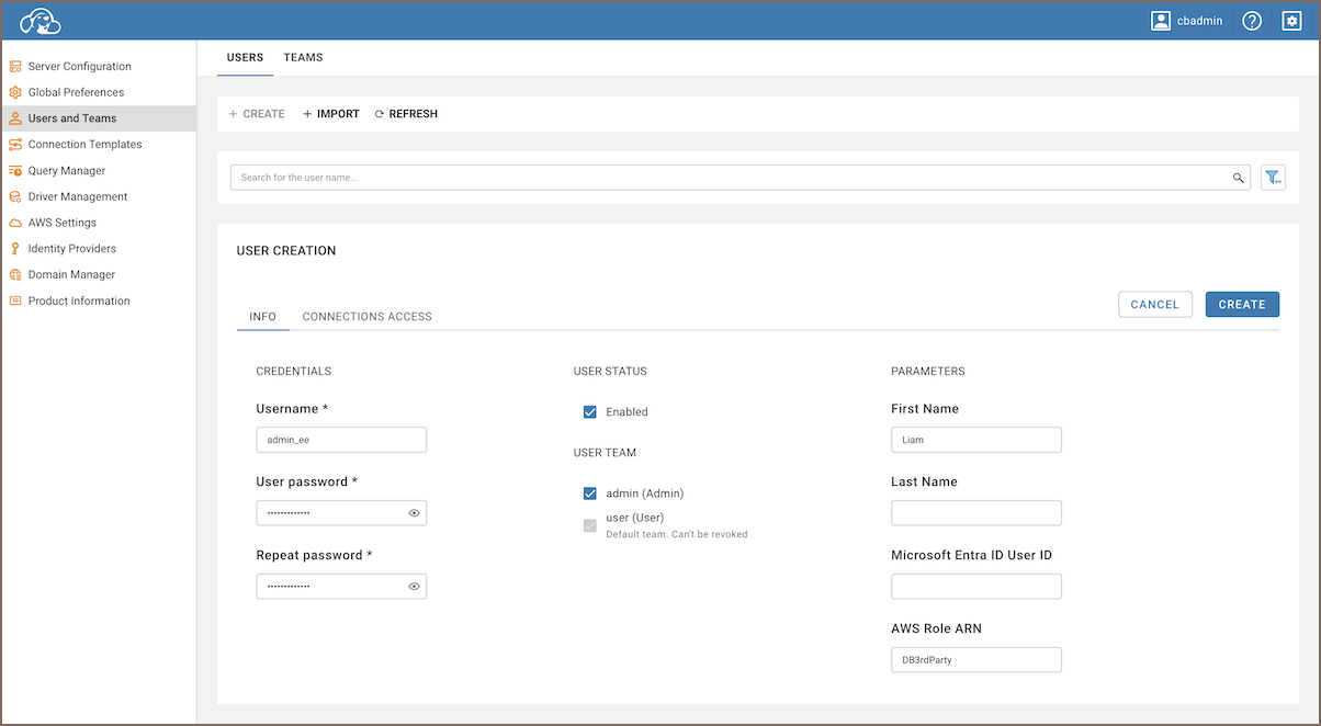Administrators cannot create AWS or Federated users directly in the application. CloudBeaver and Team Edition only works with existing AWS and Federated users. For more information on Identity providers, see Authentication methods.
