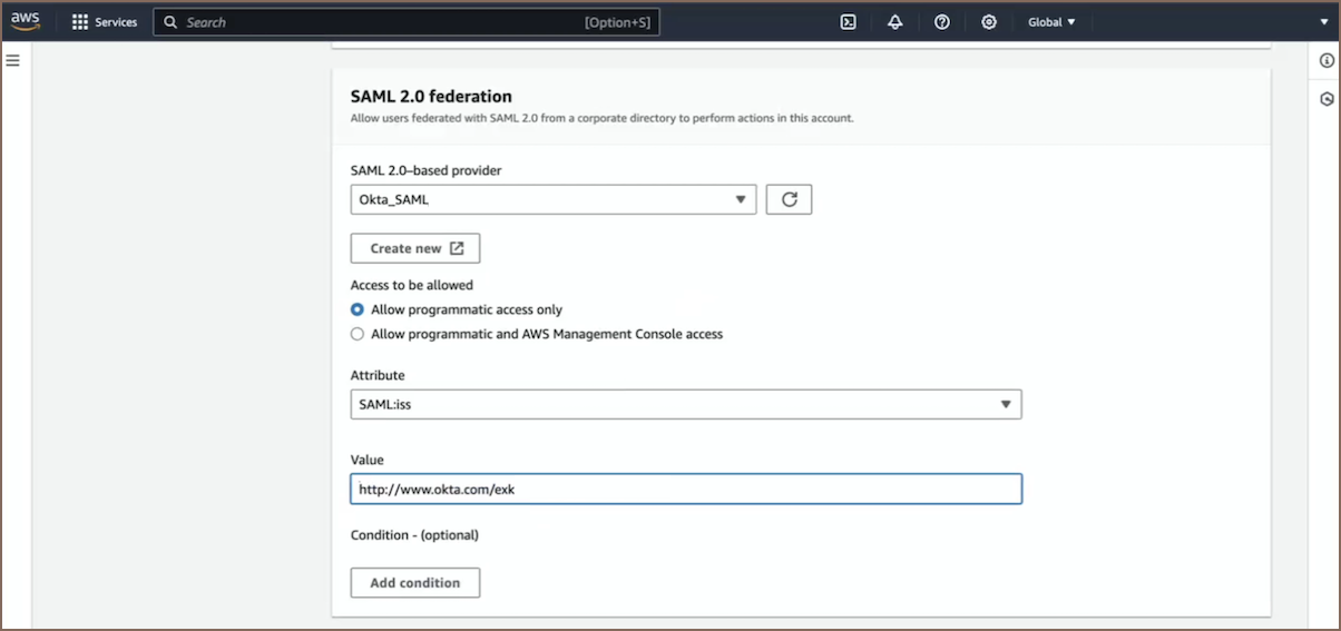 Add a SAML identity provider in AWS IAM. This allows AWS to authenticate users managed by Okta. For comprehensive instructions, refer to the official AWS documentation on identity providers.