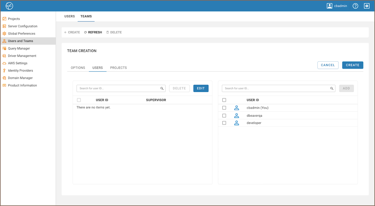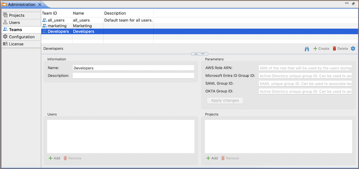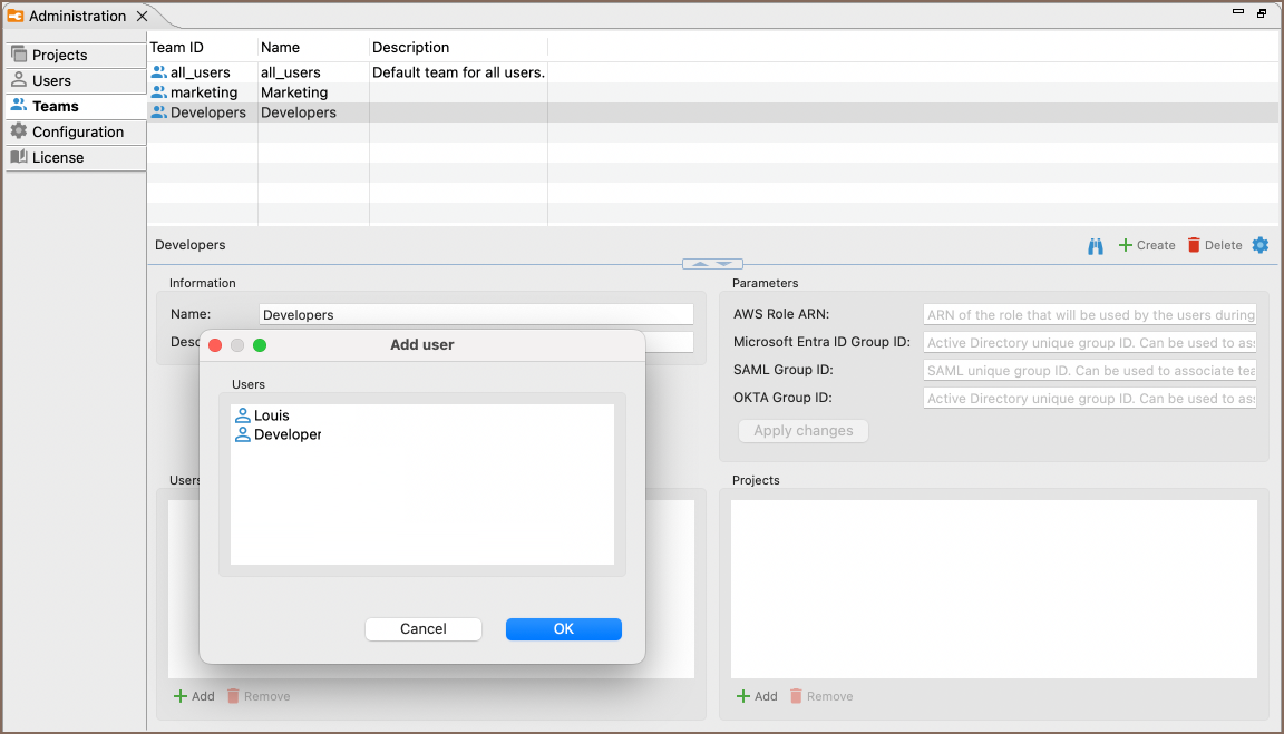 In the Administration window, administrators can manage Team memberships: