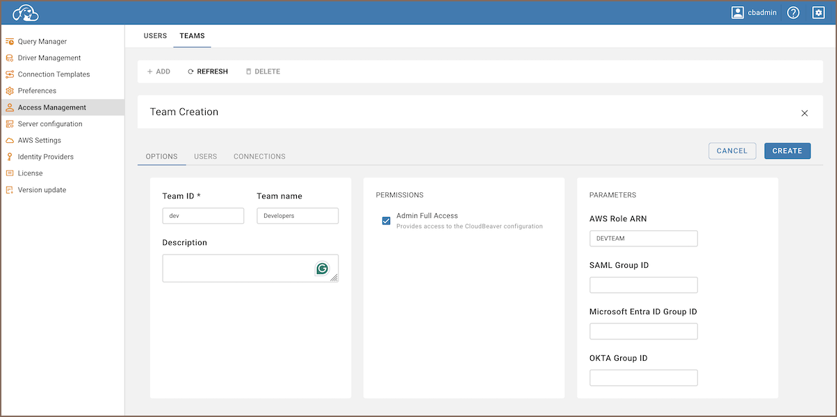 | Permissions | Specifies the level of access the team has. | Admin Full Access checkbox provides complete access to CloudBeaver configuration. |