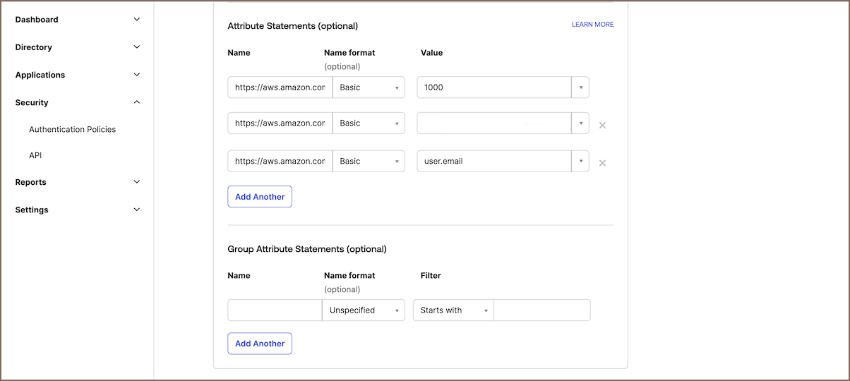 Attribute Name Name Format Value Example Notes https://aws.amazon.com/SAML/Attributes/SessionDurationBasic 3600Set in seconds, range: 900 to 43200 seconds. https://aws.amazon.com/SAML/Attributes/RoleBasic arn:aws:iam::123456789012:role/SAMLRole,arn:aws:iam::123456789012:saml-provider/OktaFormat: {roleArn},{identityProviderArn}.https://aws.amazon.com/SAML/Attributes/RoleSessionNameBasic user.emailUse a unique identifier like user.emailoruser.id.Note