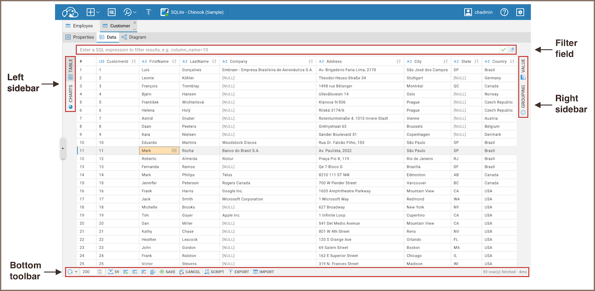 The Data editor allows to view and edit data of a database table or view. The central part of the Data editor is the data grid. The editor also provides filter field, bottom toolbar, left sidebar, right sidebar and cell context menu: