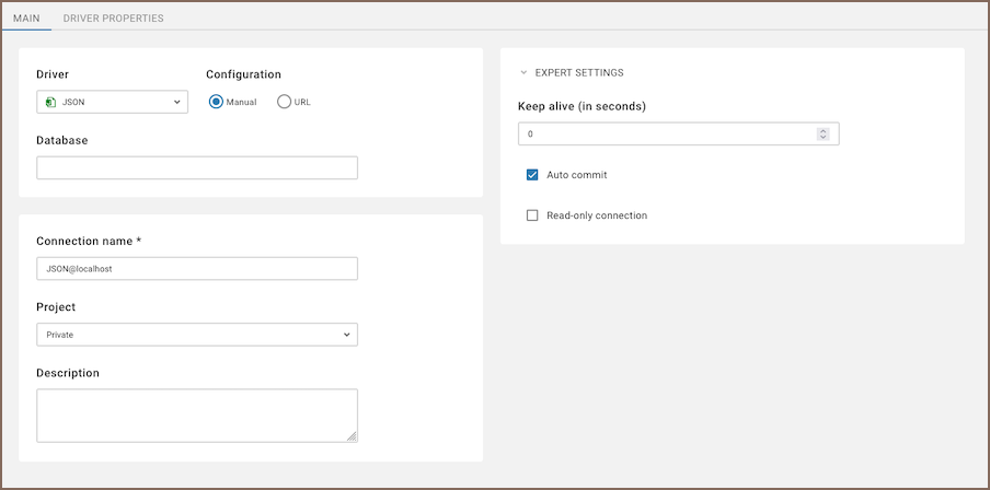 | Connection name | Enter a custom name for your connection. | Defaults to JSON@localhost. |