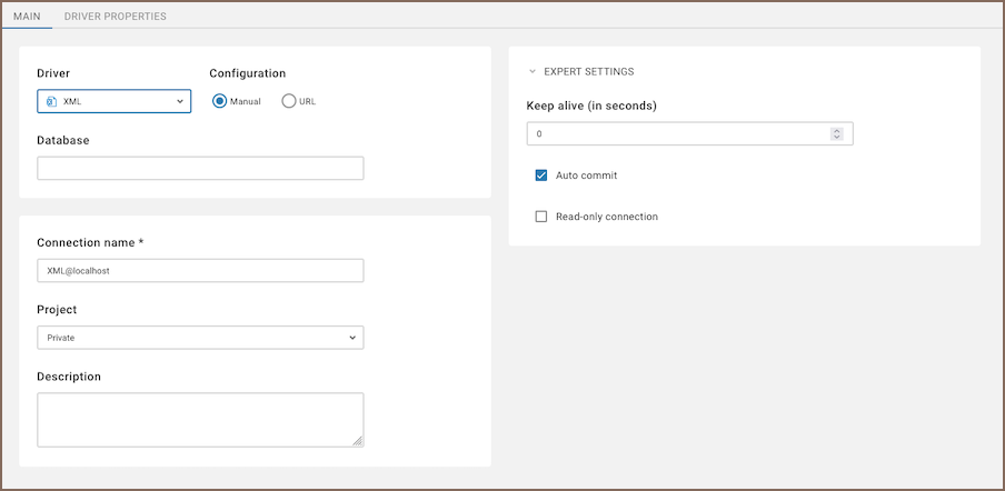 | Connection name | Enter a custom name for your connection. | Defaults to XML@localhost. |