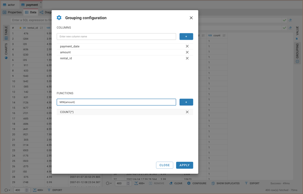 If you add several columns to the panel, CloudBeaver groups the data in the order the columns are added and calculates statistics based on the grouping.