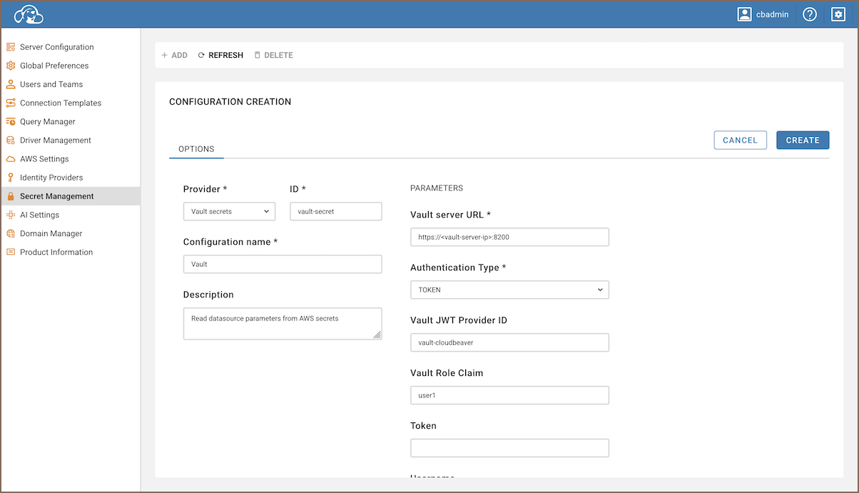 CloudBeaver supports secret providers from AWS Secrets Manager and HashiCorp Vault. Secrets can store any connection-related data, such as the host, port, and database name.