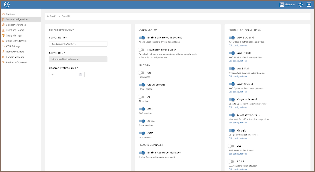 The Server Configuration panel in CloudBeaver enables administrators to manage server settings important for the server. The panel is structured into distinct sections, each dedicated to specific aspects of server management.
