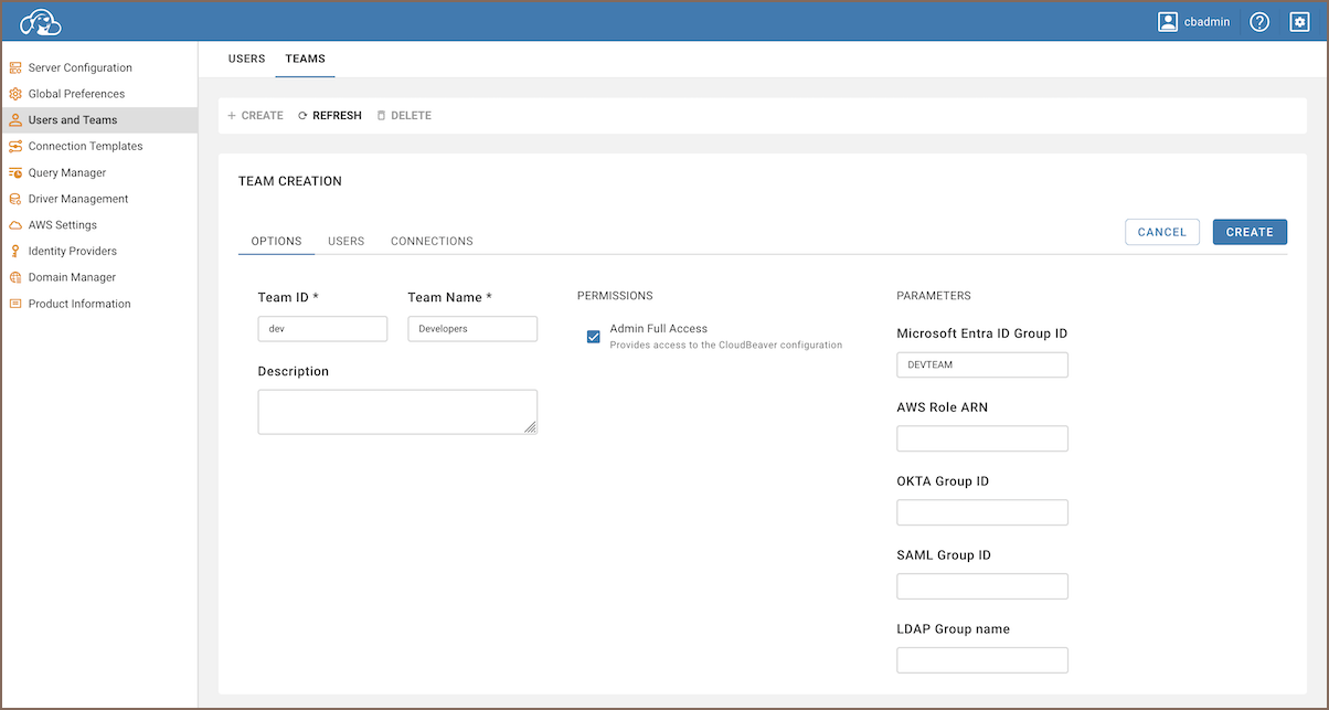 | Permissions | Specifies the level of access the team has. | Admin Full Access checkbox provides complete access to CloudBeaver configuration. |
