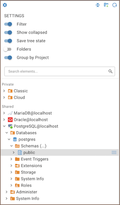 - Database objects (varying by database type, such as Tables, Views, Indexes, etc.)