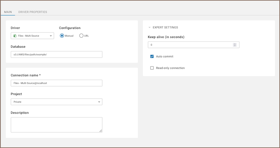 | Connection name | Enter a custom name for your connection. | Defaults to Files - Multi Source@localhost. |