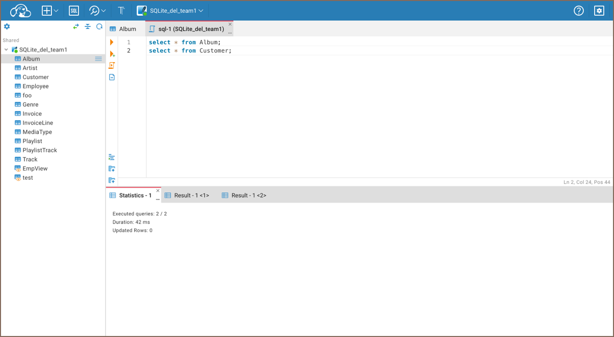 Click on the Execute SQL script icon in the left toolbar or use the Alt+X shortcut to execute the script. The summary result will be shown in the Statistics tab, and results will be shown in separate Result tabs.
