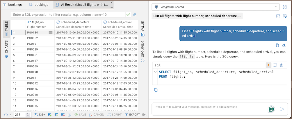 The first chat is created automatically when you open AI Chat. Each chat is named based on your first prompt. Messages related to the same query or object in the same connection are kept together in one conversation.