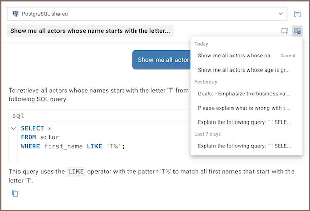 prompts the AI to generate a revised SQL query. To change the query context in AI Chat or clear history up to a