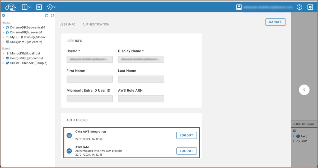 - Here, you should see two tokens. Their presence indicates that the integration of AWS OpenID and Okta has been successfully completed, and CloudBeaver has access to the necessary credentials.