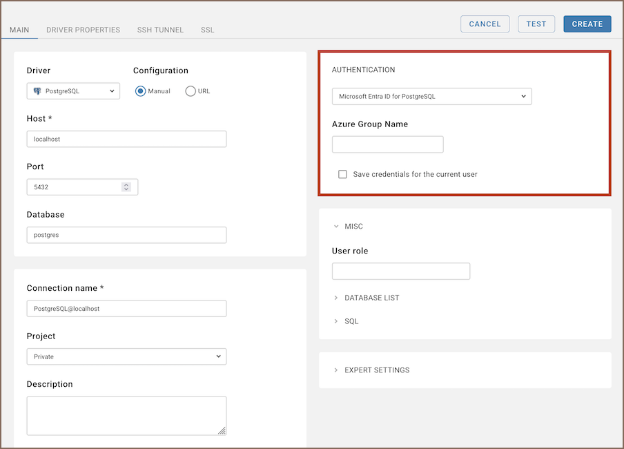 Once you have input database connection details, click the Test button to verify your settings. If everything is configured correctly, CloudBeaver should now be able to connect to your database using the Microsoft Entra ID authentication method.