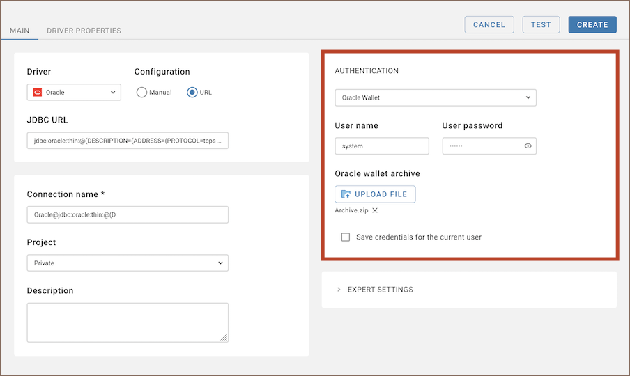 For CloudBeaver, the Oracle Wallet files must be provided as a zip archive.