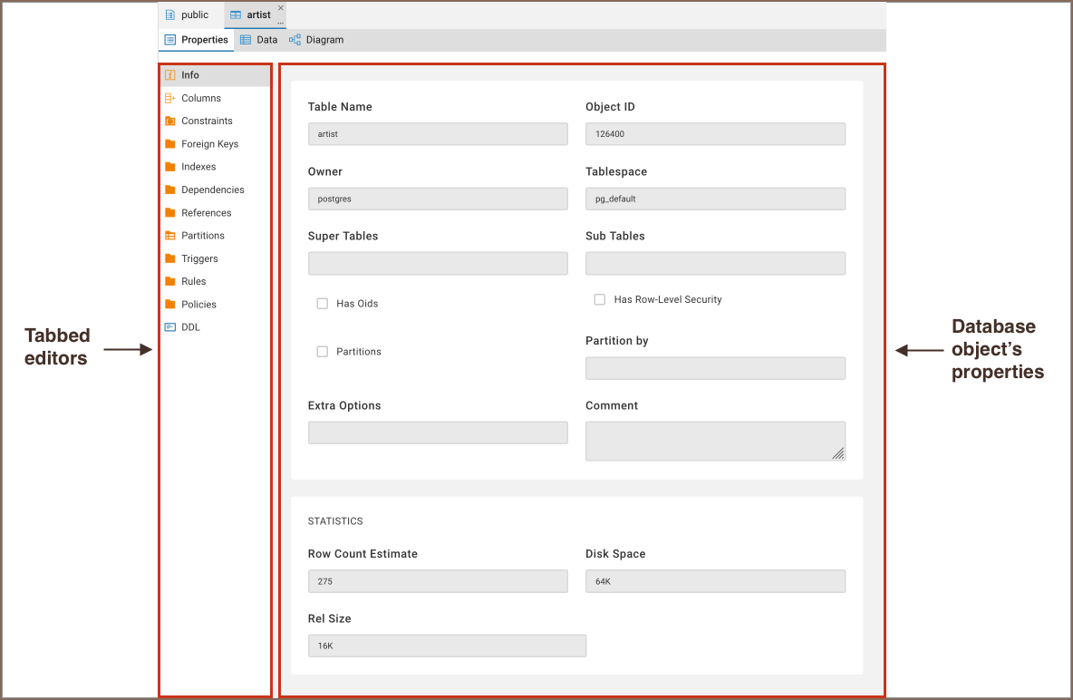 - Tabbed editors: These vary depending on your database. Depending on the database you're working with, you'll see different tabs reflecting that particular database's unique characteristics and requirements.