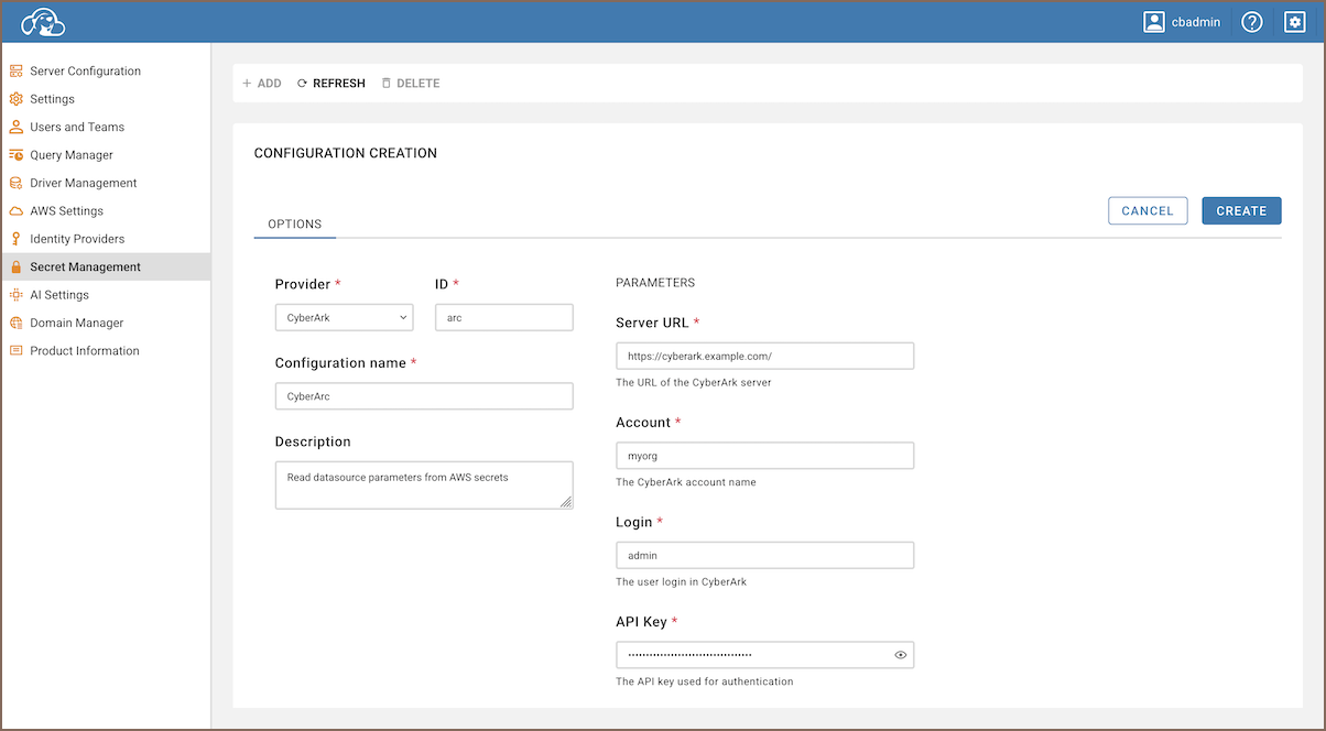 Field Description ID Enter a unique identifier for the configuration. Configuration name Unique identifier for the secret configuration in CloudBeaver. Description (Optional) Provide a brief description of this secret provider. Server URL URL of the Conjur OSS server (e.g., https://conjur.example.com).Account Conjur tenant or organization account name (e.g., myorg).Login Conjur user ID used for authentication. API Key API key associated with the Conjur user for authnlogin.Policy branch Path to the policy namespace where secrets are stored (e.g., dev/app).Trust CyberArk SSL Certificate (Optional) Trust the CyberArk server’s SSL certificate without manual import. Enable this if you're using a self-signed certificate or connecting to a server whose certificate isn't trusted by default. Info