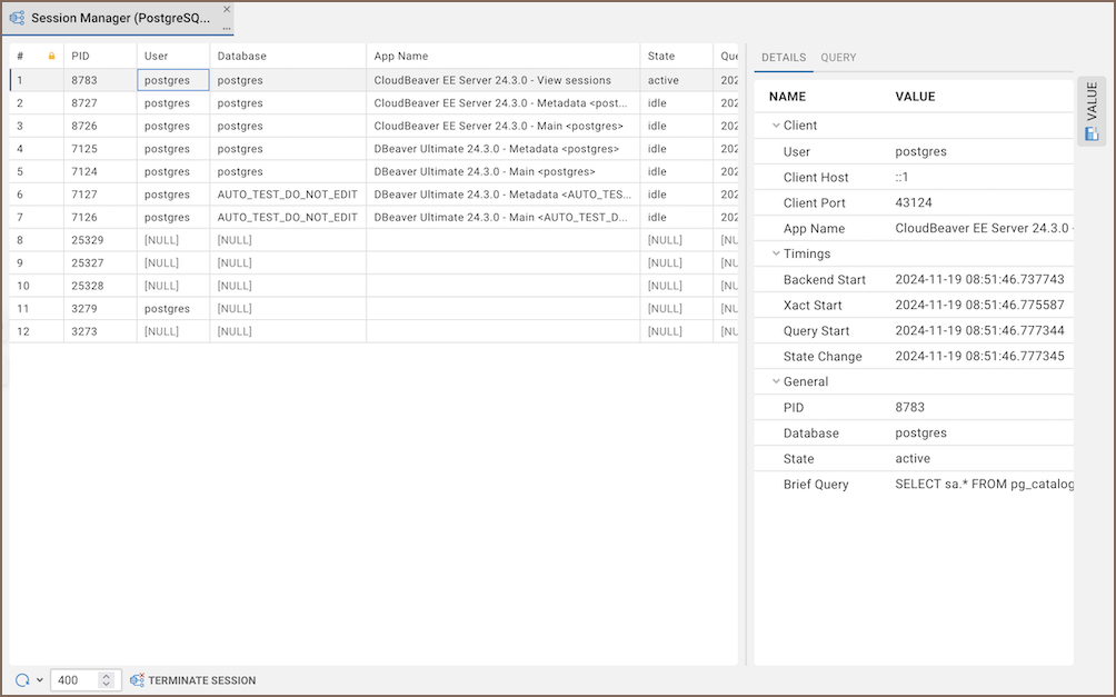 The Session Manager in CloudBeaver allows you to view and search for active database sessions.