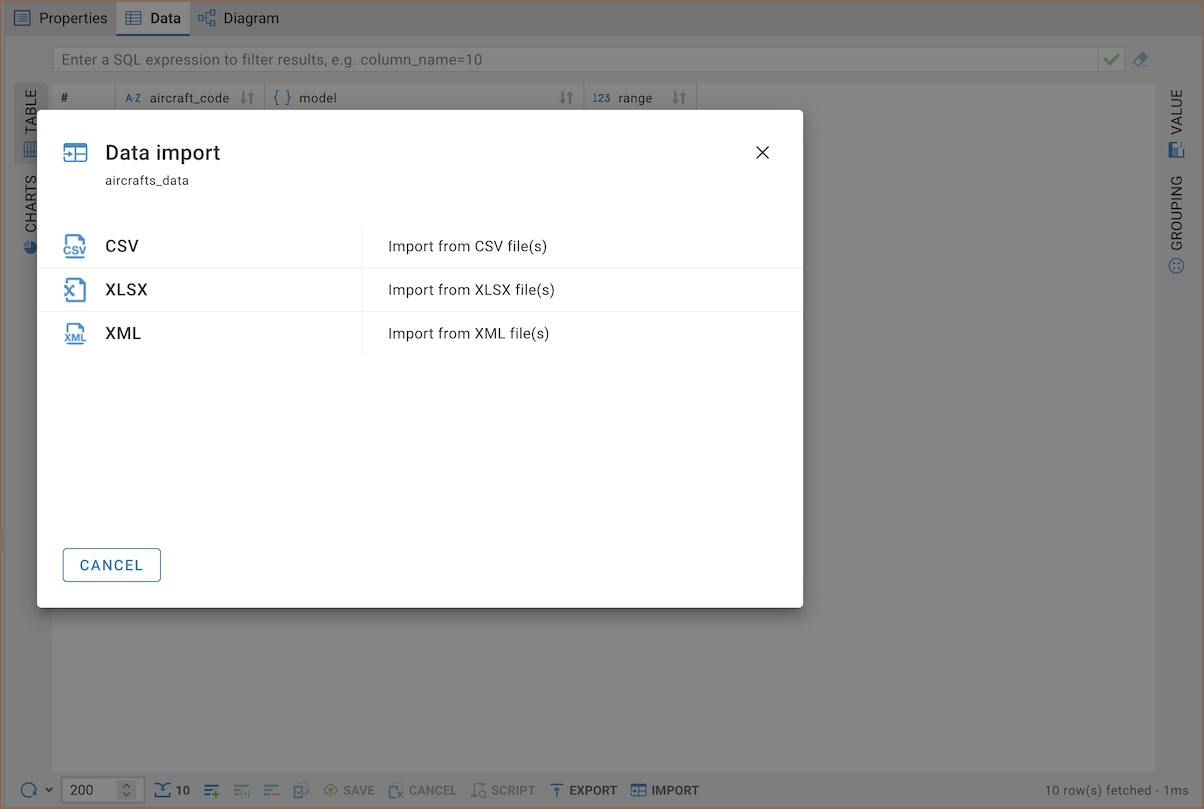 CloudBeaver supports the following formats for data import: