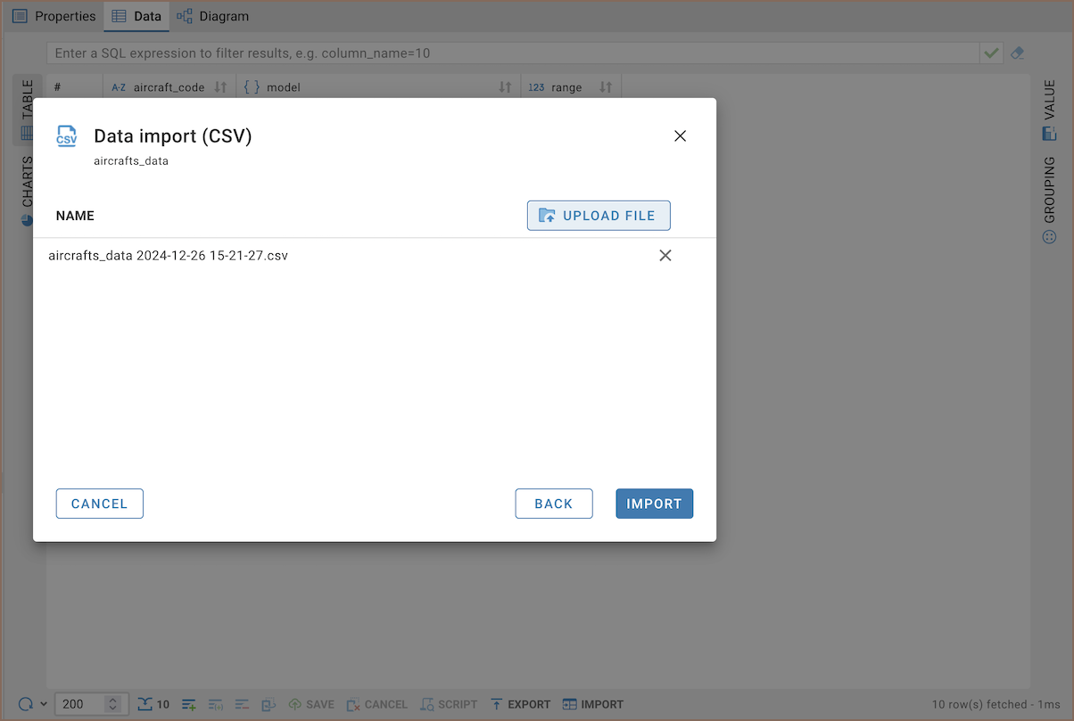 Select the table where you want to import data and click Import in the bottom toolbar.