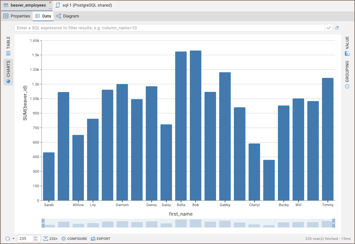 The default grid view of query results may look unremarkable. Use CloudBeaver's Charts feature to quickly explore patterns and trends without exporting data. You can visualize data in Bar, Line, Pie, or Area formats.