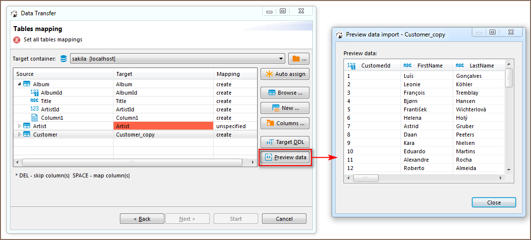 If you want tables of the target container to be named like those of source, press the Auto assign button