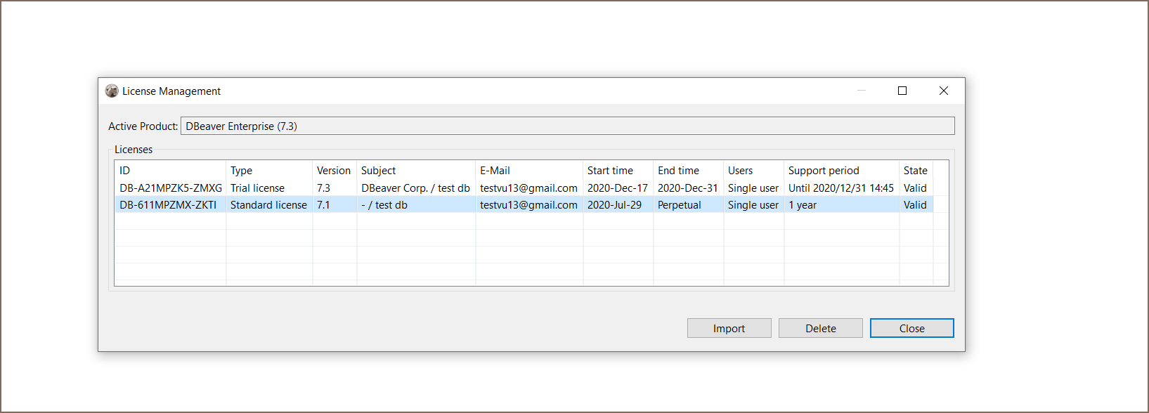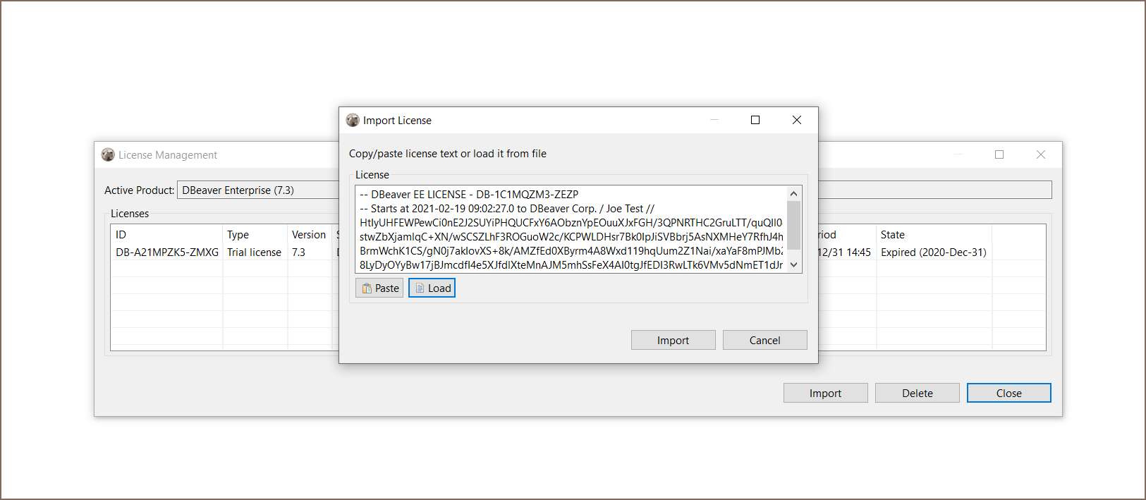After purchasing the DBeaver EE license or getting the Trial/Academic license, you will receive a License text by email. It will also be available in your personal account on our site. This License text will contain your License ID e. g. DB-821MPZFO-ZA8W, the start date and license owner’s name and company name. It is very important to import your License correctly.