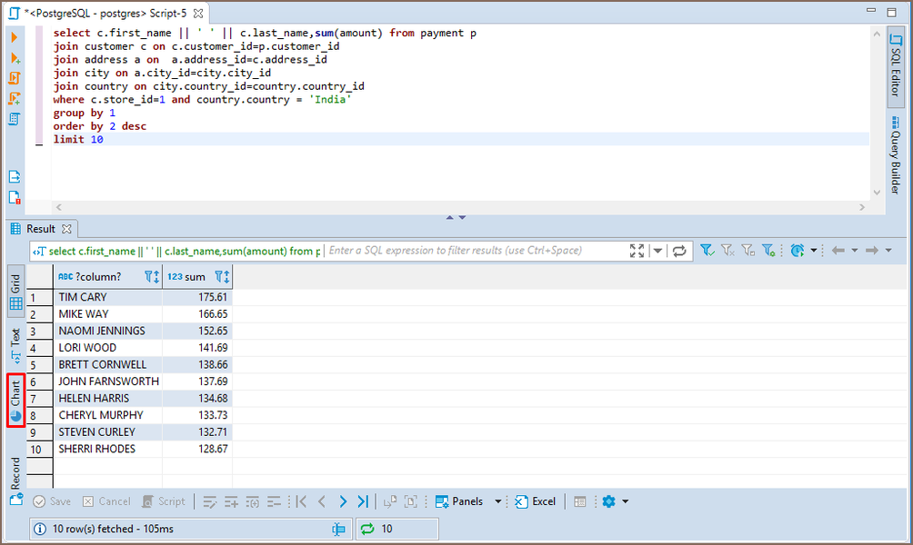 The default grid view of the query resulting data is not very impressive, especially to business analysts and other users. The Charts feature lets you quickly and easily turn your SELECT queries' output into a colorized bar chart.