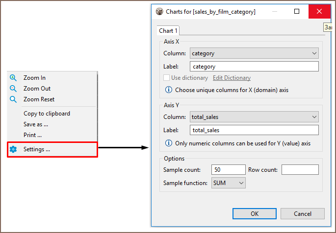 To edit the chart settings select the Charts... option in the chart's context menu and the Chart Editor will appear.