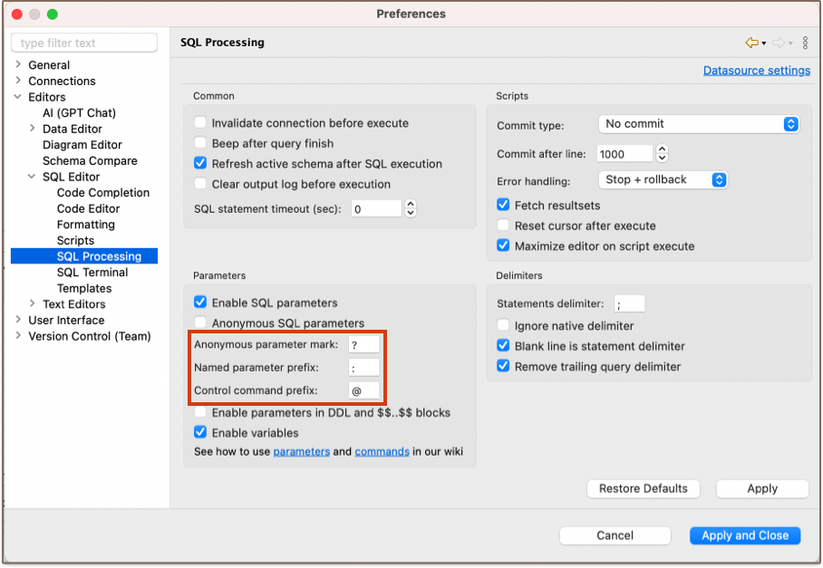 You can also use anonymous parameters (?.md), but you will need to enable them in the SQL editor preferences:
