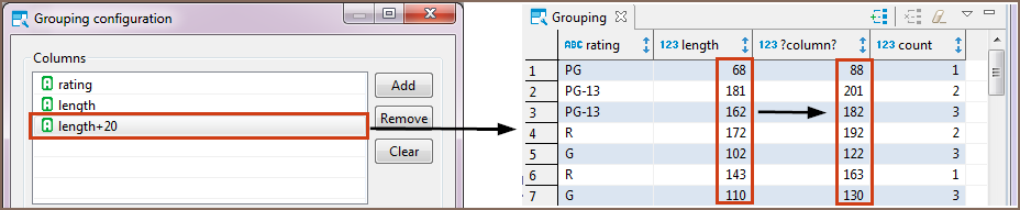 - In the Grouping Configuration window, in the Columns area, click Add, then type the column name into the new row (you can use auto-complete options DBeaver provides), and then click OK:
