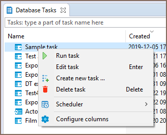 Task is a saved configuration of a database tool. It can be started from the task management view or from the menu by a single click. You can create tasks for frequently used tools. Also, tasks can be scheduled for regular execution.
