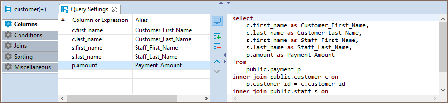 Columns tab of the Query Settings Editor contains all the columns you added by selecting column names in Visual Builder main window. In this tab you can add and remove columns using Add and Remove buttons correspondingly.