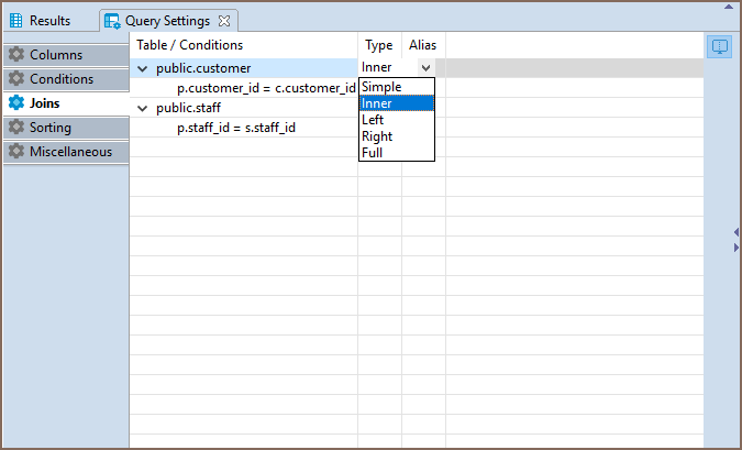 All the joins existing between the tables in Visual Query Builder main window are displayed in the Joins tab of Query Settings Editor.