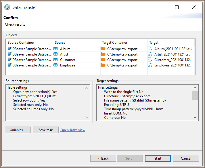 You can save the tool configuration into a task and run your task later with a single click. For example, you can start the Data Transfer wizard and configure the data export from several tables in the SQLite database into CSV files: